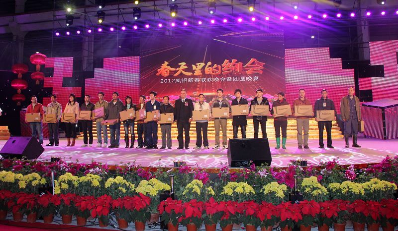 記者鐘鳳玲報道:鑼鼓歡聲送金兔,虎躍龍騰迎新春。1月15日晚18:00,鳳鋁2012年團年晚宴暨“春天里的約會”大型聯(lián)歡晚會在我司三水基地隆重舉行。吳總、常務副總經理劉志銘、副總經理嚴天利、李遠輝、郝樹根、許始元、林玉金等公司領導與4000多名鳳鋁員工歡聚一堂,觀精彩節(jié)目,品特色盆菜,共饗盛會。